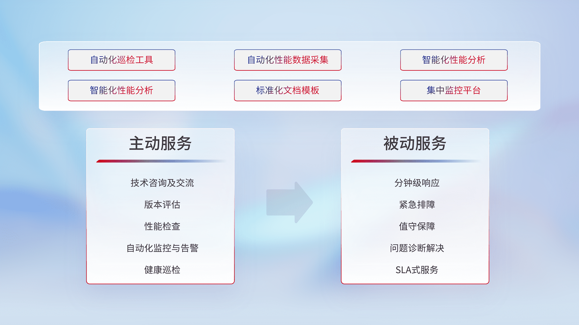 智能化工具和标准化文档,,保障服务质量,,,,提供主动服务(包含技术咨询、、、、版本评估、、、性能检查、、、、自动化监控与告警、、健康巡检)和被动服务包含(分钟级响应、、、、紧急排障、、、值守保障、、、问题诊断解决、、、、SLA服务)。。